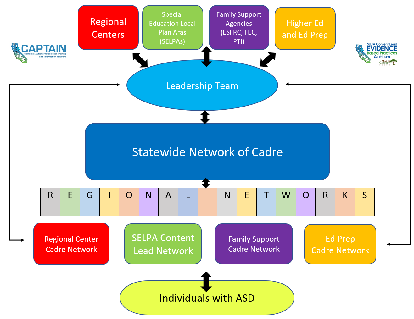 The Leadership Team is comprised of professionals from the California Department of Education, Diagnostic Centers, University Centers for Excellence in Developmental Disabilities (UCEDDs), Regional Centers and Department of Developmental Services, Family Resource Center Network, and SELPAs. Our leadership participated as trainers in the National Professional Development Center for ASD statewide training project. As a part of the dissemination efforts of the NPDC-ASD, we have established CAPTAIN to support implementation of EBPs across our state.