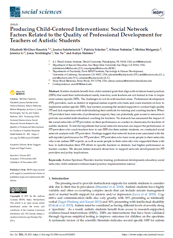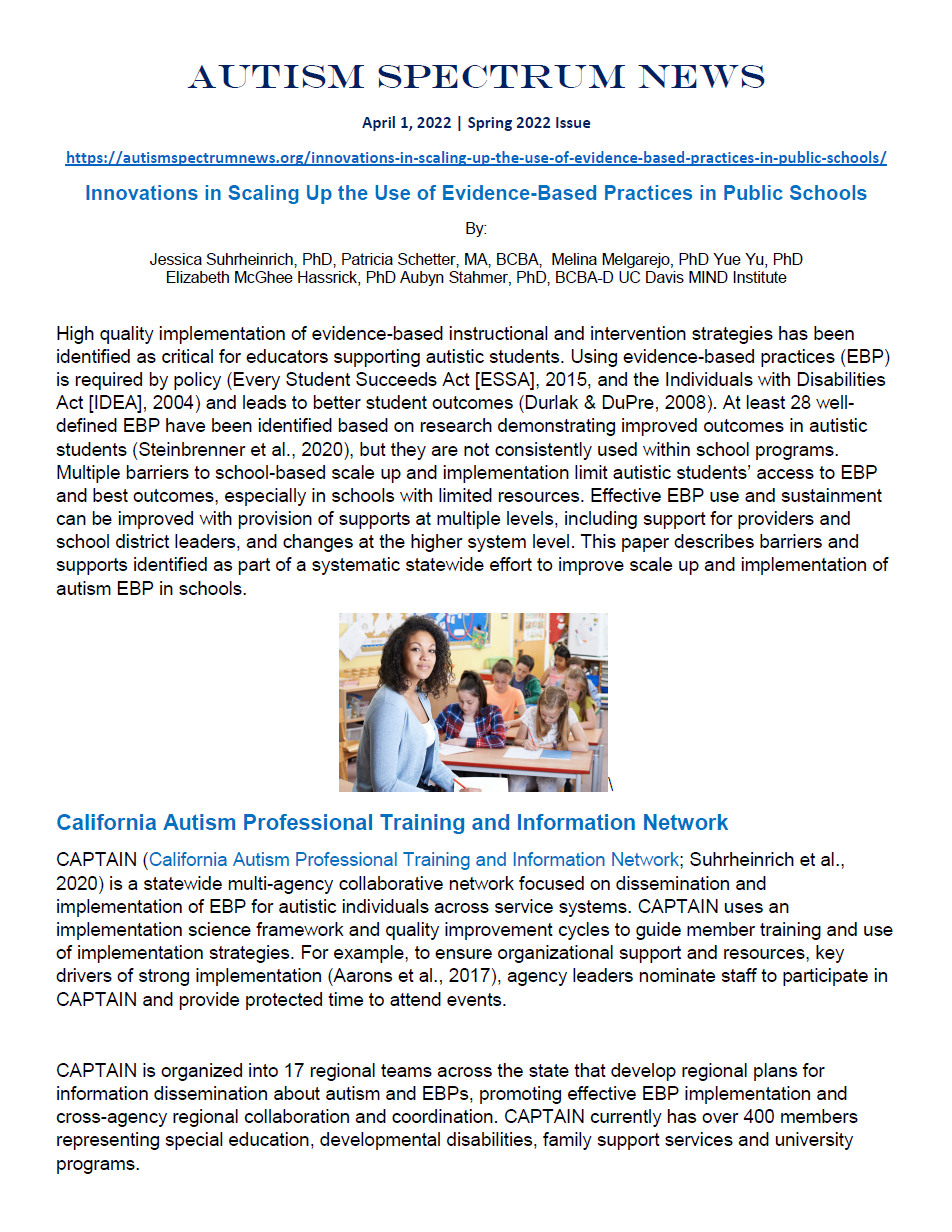 Publications Providers' Perspectives on Resources Needed for Disseminating and Implementing Evidence-Based Practices for Autism: A Qualitative Study The Role of Implementation Climate in Moderating Educator Use of Evidence-Based Practices and Outcomes for Autistic Students Implementation Readiness for Evidence-Based Autism Practices in School Systems, December-January 2023 Exploring Organizational Differences in Perceptions of Implementation Climate and Leadership in Schools: A Mixed Methods Study of Autism EBP Implementation, December 2022 Innovations in Scaling Up the Use of Evidence-Based Practices in Public Schools - Autism Spectrum News April 2022 Practice-driven Research for Statewide Scale Up: Implementation Outcomes of the California Autism Professional Training and Information Network, Journal: Community Development and Implementation, January 2022 Proactive Versus Reactive: Strategies in the Implementation of School based Services for Students with ASD Journal: Administration and Policy in Mental Health and Mental Health Services Research, December 2021 Producing Child-Centered Interventions: Social Network Factors Related to the Quality of Professional Development for Teachers of Autistic Students Journal: Social Sciences November 2021 The EDge Newsletter CDE Spring 2021 Practices and Experiences of General Education Teachers Educating Students with Autism Journal: Education and Training in Autism and Developmental Disabilities June 2021 Implementation of School-Based Services For Students with Autism: Barriers and Facilitators Across Urban and Rural Districts and Phases of Implementation Journal-Autism June 2021 Educational Interventions for Children and Youth with Autism: A 40-Year Perspective Journal of Autism and Developmental Disorders April 2021 Forms and Functions of Bridging Factors: Specifying the Dynamic Links Between Outer and Inner Contexts During Implementation and Sustainment Journal of Implementation Science April 2021 Education and Training in Autism and Developmental Disabilities DADD Online Journal: Research to Practice, December 2020 Evidence Based Practice in Child and Adolescent Mental Health September 2020 Autism Spectrum News Summer 2020 AUCD UC Davis MIND Institute/CAPTAIN Summer 2020 The EDge Newsletter CDE Summer 2020 The EDge Newsletter CDE Spring 2020 Special EDge Newsletter CDE article about CAPTAIN Implementation Science Journal article about CAPTAIN - Exploring System Factors - Stahmer, Suhrheinrich, Schetter, & Hassrick, 2017 CSHA Article About CAPTAIN